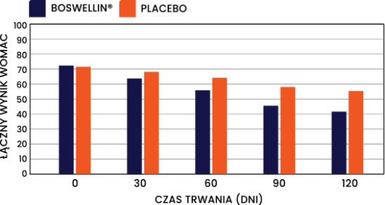 Stosowanie ekstraktu z żywicy kadzidłowca indyjskiego wykazało znaczny spadek wskaźnika WOMAC, co wskazuje na redukcję bólu, zmniejszenie sztywności stawów oraz oraz poprawę sprawności fizycznej. Boswellin® wspiera prawidłowe działanie stawów, poprawia ich elastyczność oraz pomaga utrzymać je w dobrej kondycji.